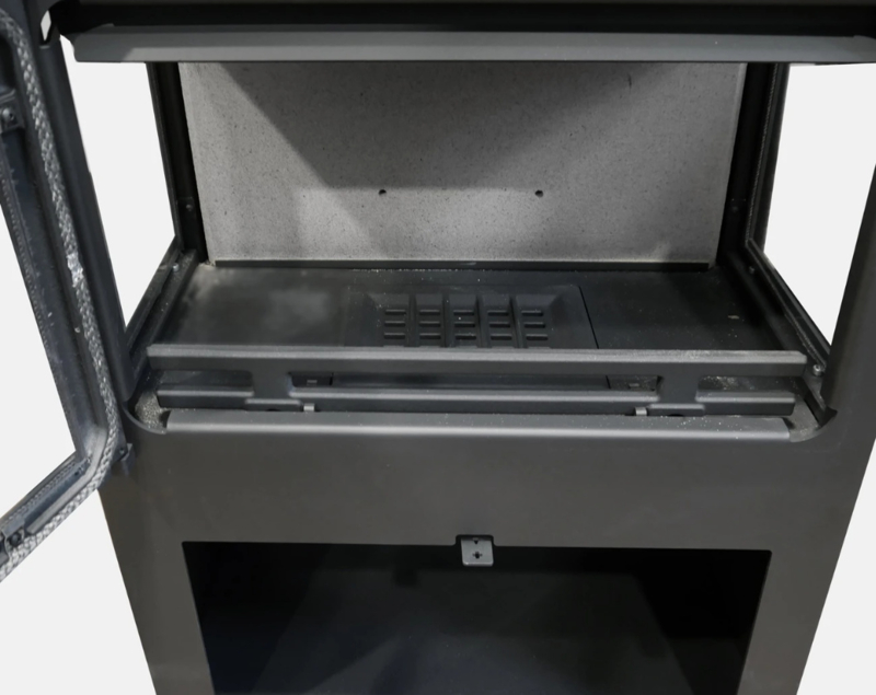 De bediening van de Marsala is overzichtelijk en praktisch. In de kachel, onder het rooster, zit een asbak die eenvoudig te verwijderen en te legen is. De deur opent naar de verbrandingskamer waar je de houtblokken plaatst. Onder de deur zit een schuif waarmee je de luchttoevoer regelt en het vuur op een praktische manier kunt sturen. Door het robuuste ontwerp voelt de kachel degelijk aan en is hij prettig in dagelijks gebruik.