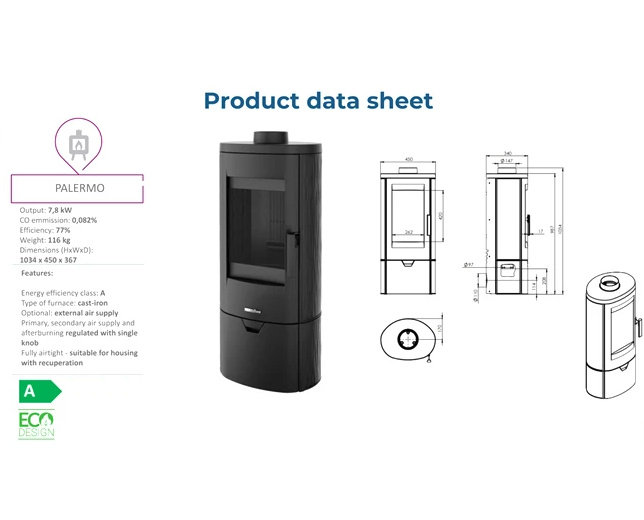 De Palermo heeft een bovenaansluiting met een diameter van 150 mm voor aansluiting op een strakke buis. Daarnaast beschikt deze kachel over een aansluiting voor externe luchttoevoer met een diameter van circa 100 mm. De verbrandingskamer biedt ruimte voor houtblokken tot circa 30 cm lengte.